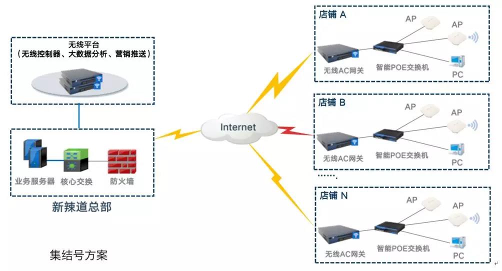 針對新辣道無線網絡需求,信銳采用分層AC的“集結號2.0”部署方案,中心端統一集中管理各分支控制器;分支控制器零配置即插即用,支持1+1災備、全網漫游,實現“一次登錄,多次有效;一地登錄,多地有效”,顧客與員工在各門店無需二次認證,可零漫游快速接入網絡。