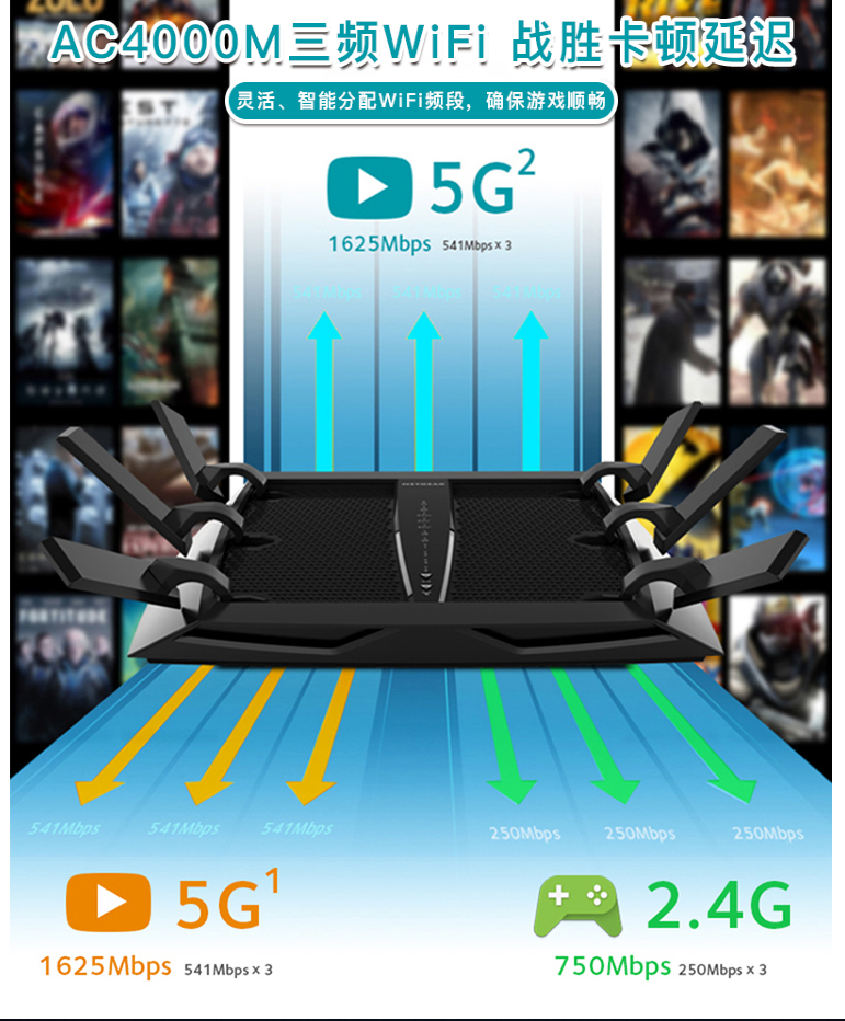 其標稱的AC4000只是三個獨立頻段的帶寬累加值,即2.4GHz的750Mbps + 5GHz(1路)的1625Mbps + 5GHz(2路)的1625Mbps,但是不管你的終端有多強,它只能工作在其中一個頻段下面,并不能同時連接雙頻或三頻來實現并發傳輸。