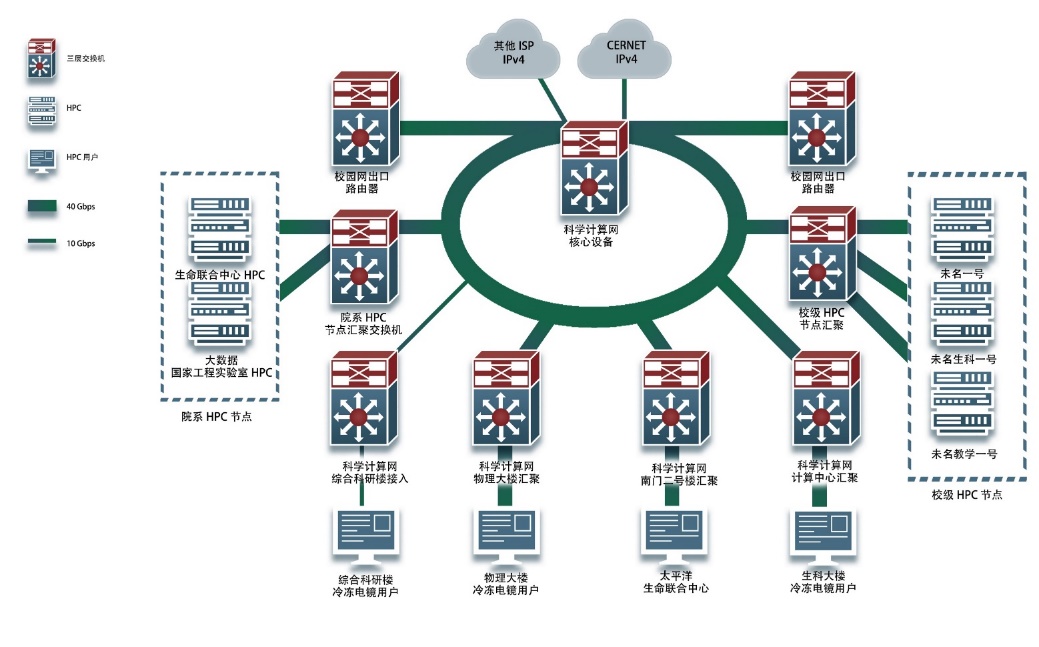 經過認真分析,計算中心從2018年開始,有計劃、有步驟、有針對性地對校園網的光纖傳輸網進行了重新規劃和擴展,著手建設一個專門用于科學計算的校園高速數據傳輸網絡,真正打通校內各學科用戶與校內多個高性能計算平臺之間的高速數據傳輸通道,全力解決各學科領域大規模數據處理和科學計算較后一公里的網絡需求。