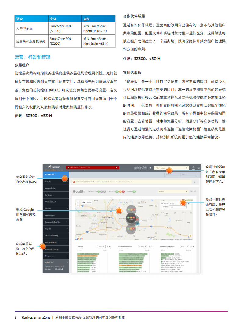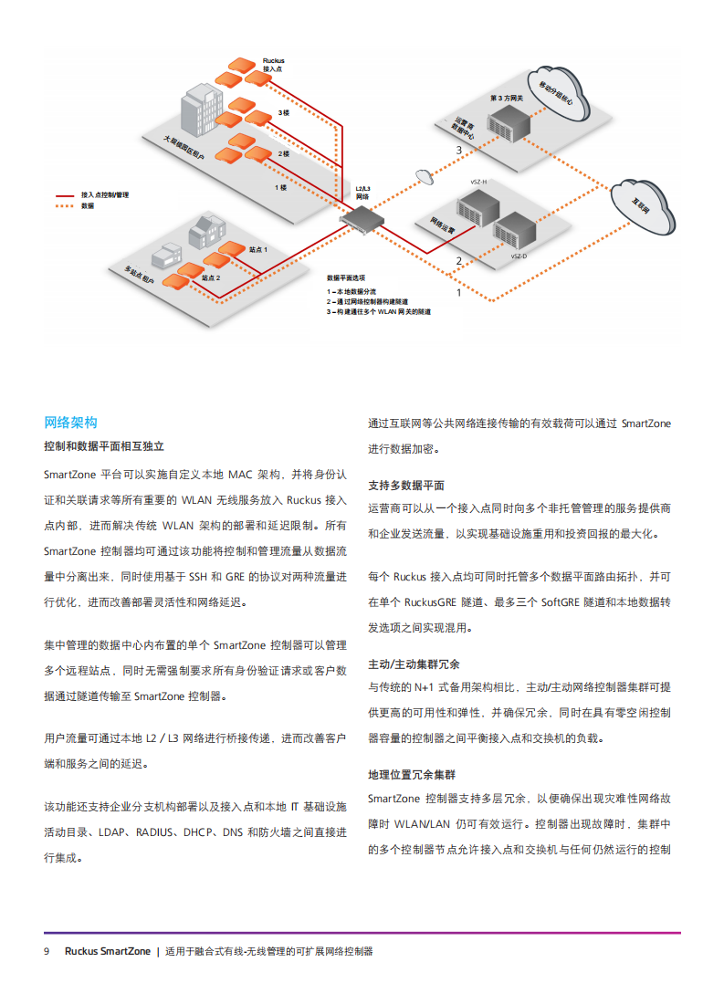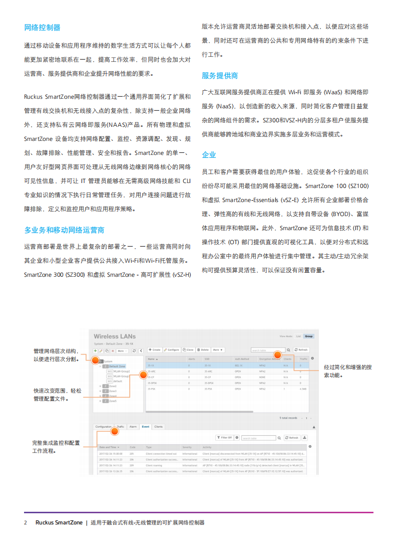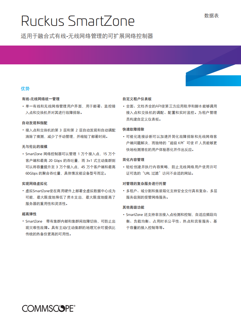 RUCKUS SmartZone 144(SZ144)支持分布式網(wǎng)絡(luò),自動(dòng)執(zhí)行重復(fù)的IT工作,并且具有可擴(kuò)展的有線和無(wú)線網(wǎng)絡(luò)管理功能,非常靈活且面向未來(lái)。 SmartZone 144可以從一個(gè)集群管理多達(dá)120,000個(gè)客戶端,多達(dá)6,000個(gè)RUCKUS接入點(diǎn)和1200個(gè)RUCKUS交換機(jī)。