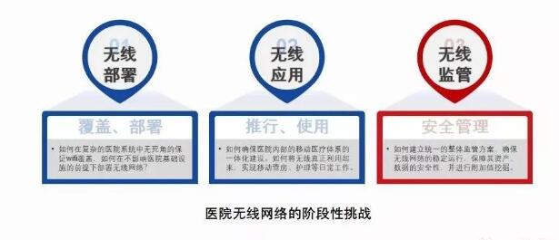 由于醫院的患者個人信息、電子病歷等內部數據較為機密,因此對無線網絡的安全性提出了更高的要求。一旦出現信息泄露、甚至惡意篡改,將會造成不可彌補的生命財產損失。再加上目前醫院的信息系統較為復雜,急需統一部署一套完整的無線安全防護體系,提升無線網絡的整體安全性。醫院無線網絡已經由部署、應用進入第三階段——無線監管階段。