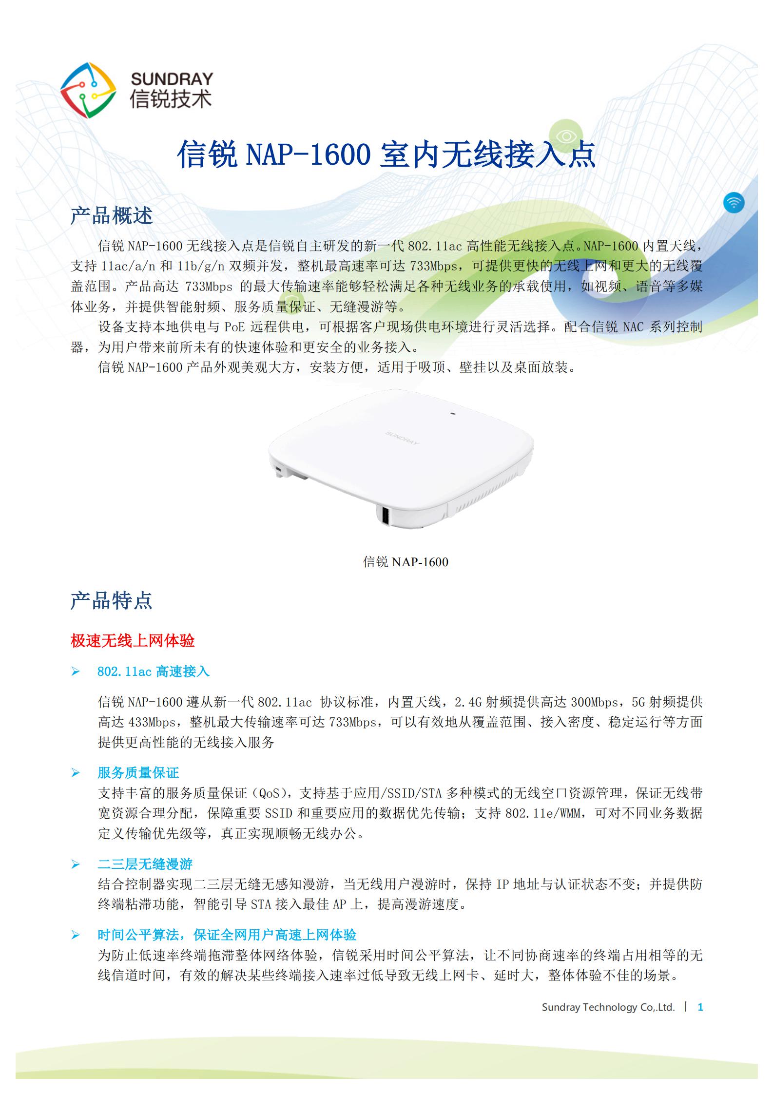 NAP-1600無線AP是信銳技術自主研發的新一代802.11ac高性能室內無線接入點。