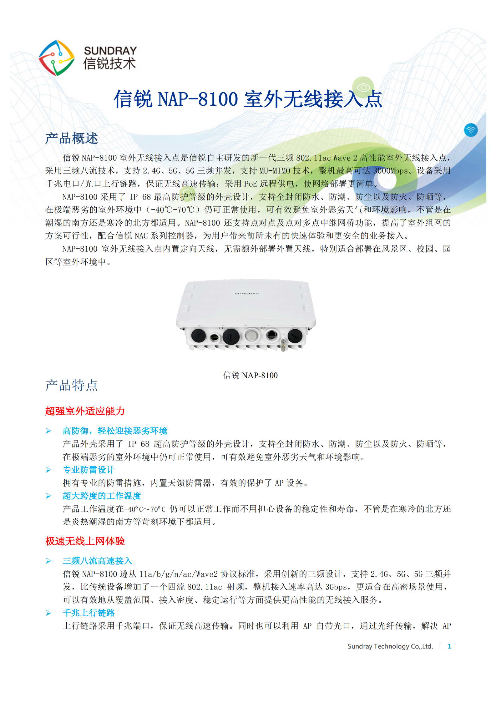 NAP-8100無線AP是信銳技術自主研發的新一代三頻802.11ac wave 2高性能室外無線接入點。